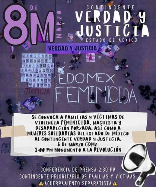 Esta movilización está a cargo de la Asamblea Amplia de Organización de la Marcha del 8M en la CDMX, quienes piden a las asistentes usar cubrebocas y gel antibacterial. De igual manera, recuerdan que en esta marcha se unirán todas las luchas feministas: contra los feminicidios y transfeminicidios, por el derecho al aborto, justicia para las víctimas, niñas y mujeres desaparecidas.