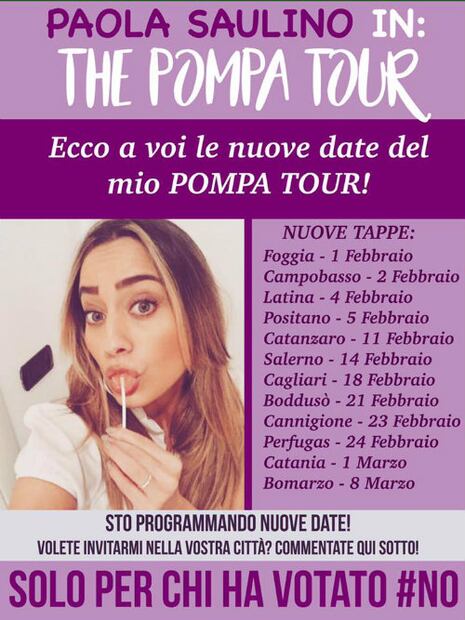 Paola Saulino es una actriz porno de Italia, y se hizo conocida cuando se atrevió a prometer un tour de sexo oral, si ganaba el “No” en el referéndum para la reforma constitucional de su país. La campaña la llevó a cabo en las redes sociales y cumplió. Organizó el Pompa Tour y recorrió varias ciudades italianas dando placer a hombres que votaron en contra del referéndum. Hizo casi 400 sesiones de sexo oral, y a pesar de que dijo que la mandíbula le dolía, afirmó que no abandonaría su promesa.