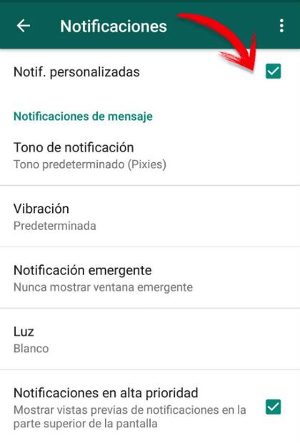 Esta opción no es sólo para grupos, también puedes usarla en tus chats con una sola persona. Aunque en este caso hay que ir a los tres puntos, seleccionar “Ver Contacto” y posteriormente “Notificaciones personalizadas”.