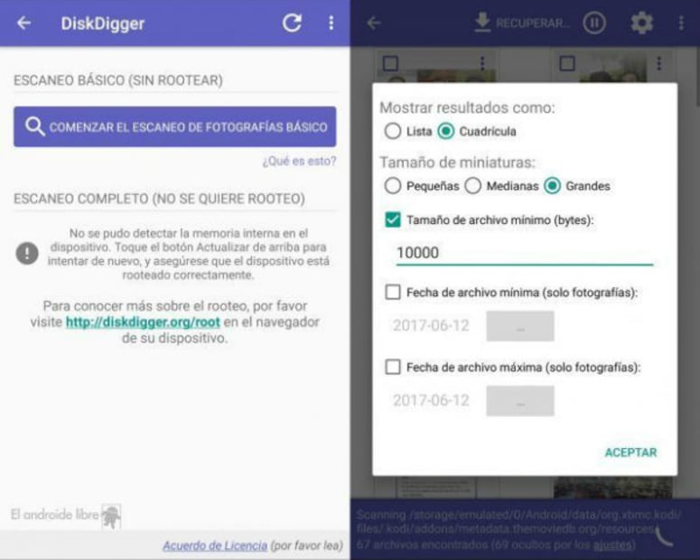Otra es DiskDigger, que analiza tu memoria en búsqueda de cualquier tipo de archivo que cumpla con las características que tú elijas. Incluso busca en la memoria RAM.