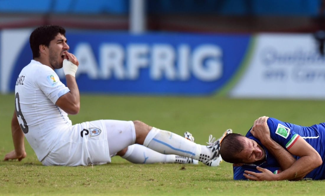 Minuto 79 del Uruguay vs Italia, con el marcador 0-0 y ambos equipos jugando por la clasificación. En un forcejeo dentro del área, Luis Suárez se lanza sobre el defensor italiano Giorgio Chiellini y le muerde el hombro. Chiellini reacciona inmediatamente, se tira al césped y muestra la marca de dientes al árbitro.