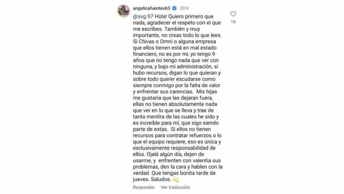 En su cuenta de Instagram Fuentes le respondió a un aficionado que le preguntó sobre la situación de Chivas; “quiero primero que nada agradecer el respeto con el que me lo escribes, no creas todo lo que lees. Si Chivas o Omni o alguna empresa que ellos tienen está en mal estado financiero, no es por mí, yo tengo 9 años en que no tengo nada que ver con ninguna, y bajo mi administración si hubo recursos, digan lo que quieran”, explicó en el mensaje.