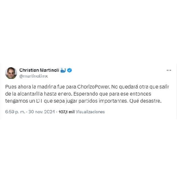 “Pues ahora la madrina fue para ChorizoPower. No quedará otra que salir de la alcantarilla hasta enero. Esperando que para ese entonces tengamos un DT que sepa jugar partidos importantes. Qué desastre”, fue el comentario de Christian Martinoli.