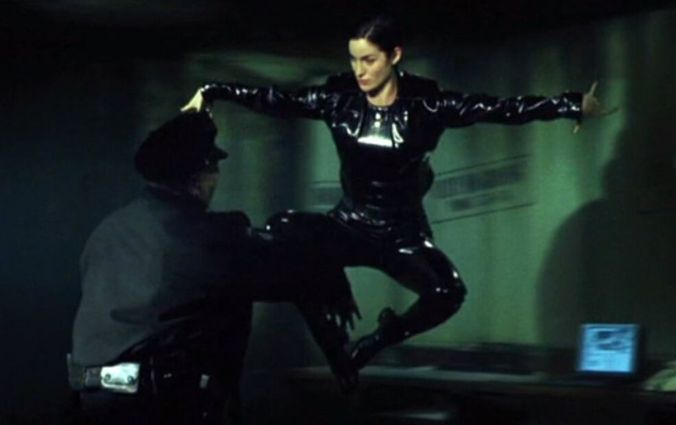 Todos recordamos a Trinity, la bella compañera de Neo en The Matrix (1999). Siempe vestía un ajustado traje negro y gafas oscuras. Además, ¿cómo olvidar esas escenas en las que quedaba “congelada” y suspendida en el aire?