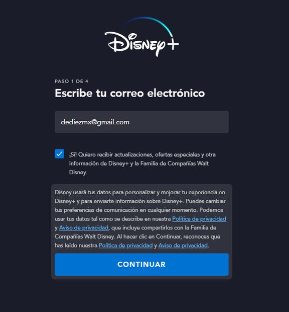 Para poder ver el contenido de Disney+, los usuarios pueden suscribirse directamente en . En este portal podrás elegir el paquete que deseas adquirir, peudes ser el de pago mensual o el de pago anual. Actualmente Disney+ está dando 7 días de puebra en México, para que los usuarios puedan ver los beneficos de suscribirse y el tipo de contenido que podrán ver. Lo único que necesitas para registrarte es un correo electrónico y crear un contraseña.