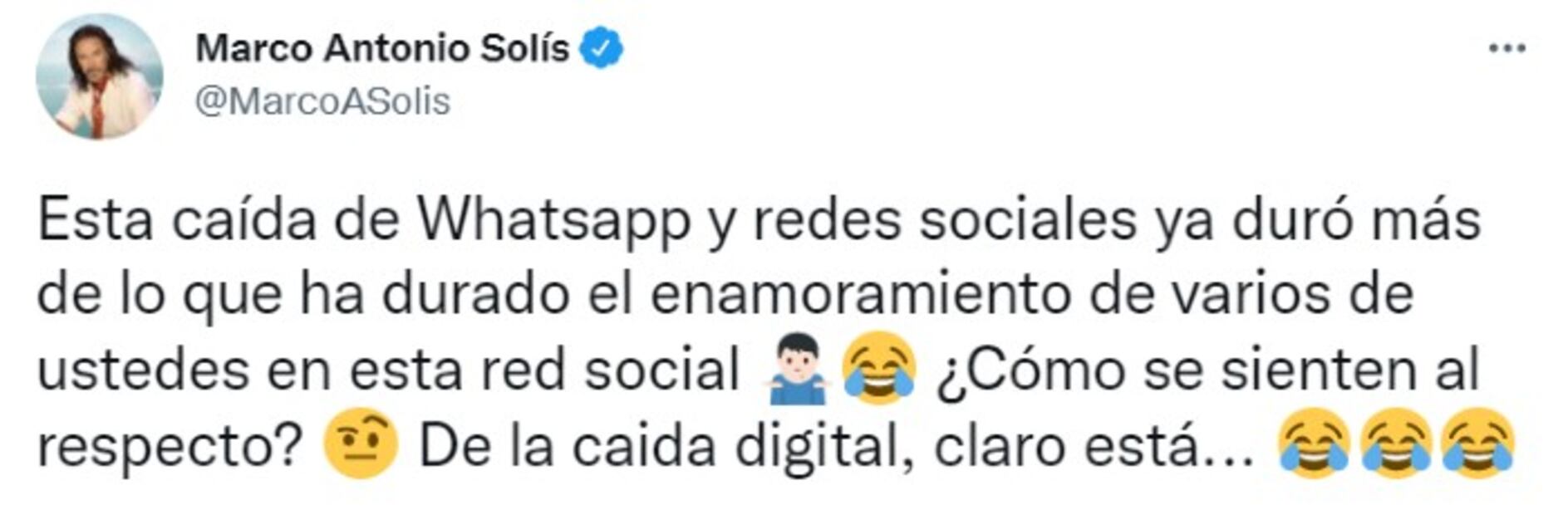 El autor de Si no te hubieras ido, ha demostrado que es poeta y en el aire las compone, pues ha lanzado tuits alusivos a la caída de las redes sociales que se registró hace algunas semanas, e incluso sobre el sismo que ocurrió en marzo de 2021.