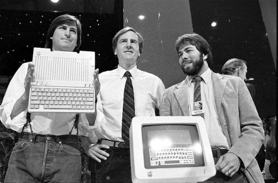 Steve Jobs, John Sculley y Steve Wozniak, cofundador de Apple, presentan la nueva computadora Apple IIc en San Francisco, en 1984. (Foto: AP)