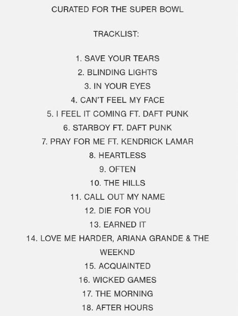 En redes sociales comenzó a circular el supuesto setlist de The Weeknd para el medio tiempo del Super Bowl LV. De acuerdo con la imagen, el artista interpretará varias canciones de su nuevo álbum After Hours, pero también algunos sencillos de Starboy y Beauty Behind the Madness.